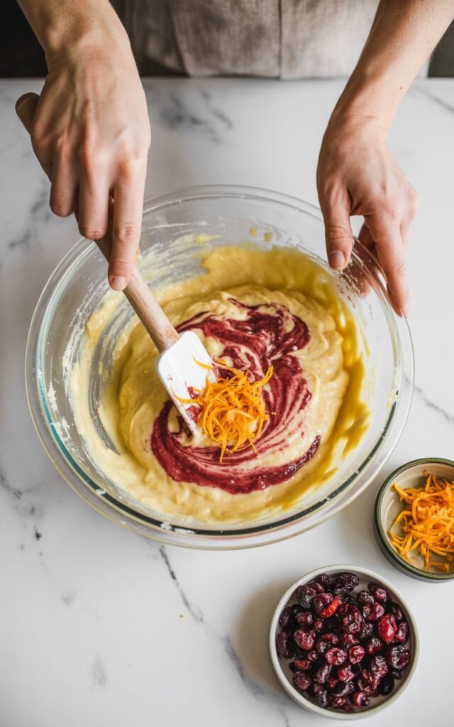 Chopped dried cranberries are folded in last so they stay evenly distributed.