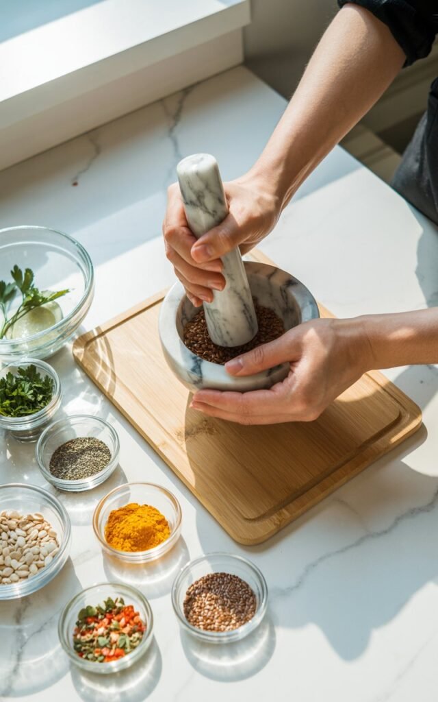 We gently crush seeds like fennel before mixing. This releases aroma and helps digestion without turning everything into dust.