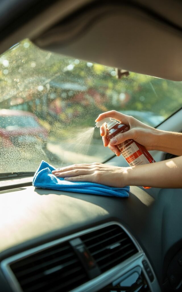 Why: Spraying directly can cause overspray on the dashboard, seats, or electronics.