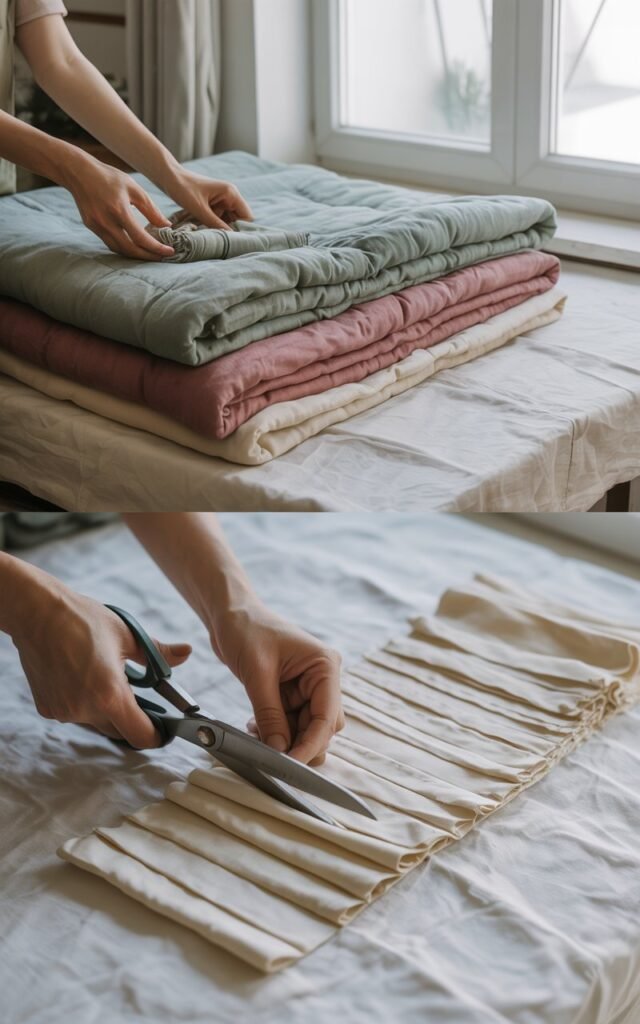 Once the bedding is clean, I lay it flat and cut it into long strips. I aim for strips about one to two inches wide.